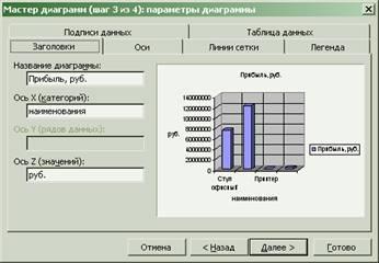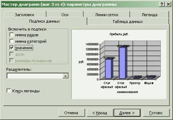 На третьем шаге на вкладке "Заголовки" вводим названия оси категорий и оси значений (рис.2.10), на вкладке "Легенда" отказываемся от отображения легенды, т.к в ней нет смысла при формировании диаграммы, состоящей из одного ряда, на вкладке "Подписи данных" устанавливаем флажок в пункте "Включить в подписи … значения" (рис.2.11).