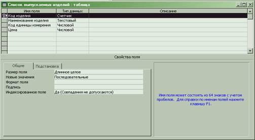 Во всех таблицах, в которых это необходимо, устанавливаем ключевые поля. Так, например, в таблице "Список выпускаемых изделий" выделяем поле "Код изделия" и выполняем команду его контекстного меню "Ключевое поле" (рис.3.2).
