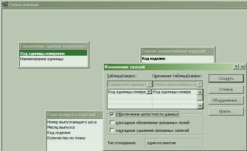 Нажав кнопку "Закрыть", переходим к созданию связей между таблицами. Чтобы связать, например, таблицы "Список выпускаемых изделий" и "Справочник единиц измерения" по одноименным полям "Код единицы измерения", "перетаскиваем" поле из одной таблицы в другую. В открывшемся окне "Изменение связей" (рис.3.4) устанавливаем флажок в поле "Обеспечение целостности данных" и видим, что создан тип отношения "один-ко-многим".
