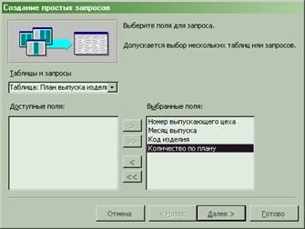 Для создания первого запроса воспользуемся командой окна базы данных "Создание запроса с помощью мастера". На первом шаге мастера в окне "Создание простых запросов" в выпадающем списке "Таблицы и запросы" выбираем таблицу "План выпуска изделий". Затем из списка "Доступные поля" перемещаем кнопкой поля "Номер выпускающего цеха", "Месяц выпуска", "Код изделия" и "Количество по плану" в список "Выбранные поля" (рис.3.5).
