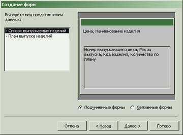 В окне базы данных переключаемся к группе "Формы" и выполняем команду "Создание формы с помощью мастера". Выбираем запрос "Запрос 1" и включаем в список выбранных полей все его поля. На втором шаге Мастера форм выбираем вид представления данных "Список выпускаемых изделий" - "Подчиненные формы" (рис.3.8).