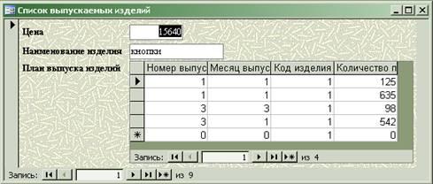 Внешний вид на третьем шаге устанавливаем "табличный", стиль на четвертом - "Рисовая бумага", на пятом шаге соглашаемся с предложенными названиями главной и подчиненной форм: "Список выпускаемых изделий" и "План выпуска изделий подчиненная форма" соответственно. Получаем форму, внешний вид которой изображен на рис.3.9.
