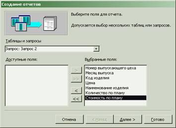 Создание отчета непосредственно по указанному в задании запросу невозможно, т.к запрос на обновление не может быть источником строк, поэтому используем таблицу "Выпускаемые изделия", измененную запросом. На первом шаге Мастера выбираем в поле "Таблицы и запросы" необходимый запрос и все его поля перемещаем в список выбранных (рис.3.11).