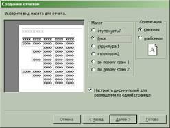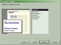 На втором шаге отказываемся от группировки, на третьем отказываемся от сортировки содержимого запроса, на четвертом выбираем макет "блок", на пятом - стиль "Деловой" (рис.3.12), на последнем вводим имя отчета "Выпускаемые изделия" и завершаем создание отчета.