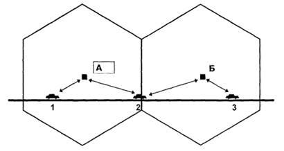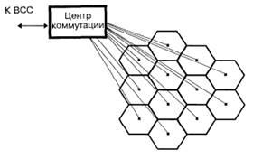 В центре каждой ячейки находится базовая станция, обслуживающая все подвижные станции (абонентские радиотелефонные аппараты) в пределах своей ячейки (рис. 1.2.). При перемещении абонента из одной ячейки в другую происходит передача его обслуживания от одной базовой станции к другой. Все базовые станции системы, в свою очередь, замыкаются на центр коммутации, с которого имеется выход во Взаимоувязанную сеть связи (ВСС) России, в частности, если дело происходит в городе, - выход в обычную городскую сеть проводной телефонной связи.