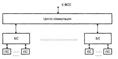 Рис. 1.3. Упрощенная функциональная схема системы сотовой связи: БС – базовая станция; ПС – подвижная станция (абонентский радиотелефонный аппарат).