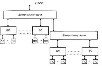В действительности ячейки никогда не бывают строгой геометрической формы. Реальные границы ячеек имеют вид неправильных кривых, зависящих от условий распространения и затухания радиоволн, т.е. от рельефа местности, характера и плотности растительности и застройки и тому подобных факторов. Более того, границы ячеек вообще не являются четко определенными, так как рубеж передачи обслуживания подвижной станции из одной ячейки в другую может в некоторых пределах смещаться с изменением условий распространения радиоволн и в зависимости от направления движения подвижной станции. Точно так же и положение базовой станции лишь приближенно совпадает с центром ячейки, который к тому же не так просто определить однозначно, если ячейка имеет неправильную форму. Если же на базовых станциях используются направленные (не изотропные в горизонтальной плоскости) антенны, то базовые станции фактически оказываются на границах ячеек. Далее, система сотовой связи может включать более одного центра коммутации, что может быть обусловлено эволюцией развития системы или ограниченностью емкости коммутатора. Возможна, например, структура системы типа показанной на рис. 1.4. – с несколькими центрами коммутации, один из которых условно можно назвать «головным» или «ведущим».