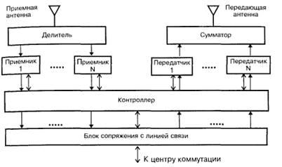 Приемник и передатчик имеют ту же структуру, что и в подвижной станции, за исключением того, что здесь в них отсутствуют ЦАП и АЦП, поскольку и входной сигнал передатчика, и выходной сигнал приемника имеют цифровую форму.