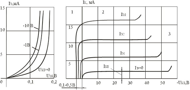 Выходные ВАХ имеют три характерные области: 1 – сильная зависимость Iк от UКБ (нелинейная начальная область); 2 – слабая зависимость Iк от UКБ (линейная область); 3 – пробой коллекторного перехода.