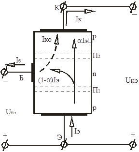 Полный ток эмиттера IЭ определяется количеством инжектированных эмиттером основных носителей заряда. Основная часть этих носителей заряда достигая коллектора, создает коллекторный ток Iк. Незначительная часть инжектированных в базу носителей заряда рекомбинируют в базе, создавая ток базы IБ. Следовательно, ток эмиттера разделятся на токи базы и коллектора, т.е. IЭ = IБ + Iк.