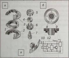 а — магнитоэлектрический генераторный с когтеобразным статором; б — магнитоэлектрический коммутаторного типа; в — датчик Холла; 1 — катушка; 2, 3 — клювообразные половины статора; 4 — магнит; 5,6 — клювообразные половины ротора; 7 — приводная втулка; 8 — зуб чатый ротор; 9 — зубчатый статор; 10 — экран (шторки); 11 — чувствительный элемент датчика Холла; 12 — микросхема