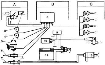 В — устройства управления и обеспечения: 8 — электронный блок управления, 9 — блок реле, 10 — топливный насос, 11 — аккумуляторная батарея, 12 — выключатель зажигания. С — устройства выходных параметров: 13 — рабочие форсунки, 14 — клапан добавочного воздуха, 15 — пусковая форсунка