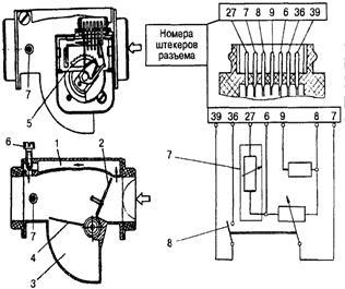1 — обводной канал, 2 — измерительная заслонка, 3 — демпферная камера, 4 — пластина демпфера, 5 — потенциометр, 6 — винт качества (состава) смеси холостого хода, 7 — датчик температуры, 8 — контакты топливного насоса