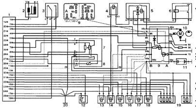 1 — разъем электронного блока управления, 2 — катушка зажигания, 3 — выключатель положения дроссельной заслонки, 4 — пусковая форсунка, 5 — реле пуска холодного двигателя (послестартовое реле), б — термореле, 7 — расходомер воздуха, 8 — датчик температуры поступающего воздуха, 9 — блок реле (питание системы впрыска и включение топливного насоса), 10 — топливный насос, 11 — аккумуляторная батарея, 12 — датчик температуры охлаждающей жидкости, 13—18 — рабочие форсунки (инжекторы), 19 — дополнительные резисторы, вариант без дополнительных резисторов показан штриховыми линиями ("LE-J"), 20 — главная точка соединения с "массой" (шпилька крепления впускного коллектора)