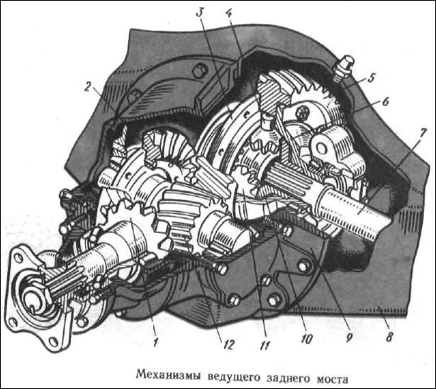 Ведуча конічна шестірня 3 встановлюється в двох конічних роликових підшипниках у картері підшипників 8 аналогічно ведучій конічній шестірні заднього моста. На шліцьовому кінці ведучої конічної шестірні 3 встановлюється ведена конічна шестірня 10, закріплена корончатою гайкою 11 і яка передає крутний момент до ведучої конічної шестірні середнього моста від вала 30 приводу мостів.