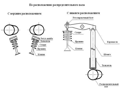 Двигателя могут иметь нижнее расположение клапанов, при котором клапаны размещены в блоке цилиндров, и верхнее, когда они расположены в головке цилиндров.