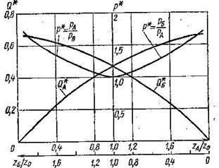 График относительного различия давлений симметричен относительно оси, соответствующей среднему положению заслонки . При любом соотношении взаимосвязанных смещений и по графику можно найти полный расход через ветви гидроусилителя. При среднем положении заслонки это расход максимален.