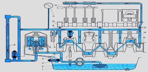 1 - масляный поддон, 2 - масляный насос, 3 - редукционный клапан масляного насоса, 4 - масломерный щуп, 5 - промежуточная шестерня, 6 - масляный фильтр, 7- редукционный (температурный) клапан, 8 - масляный радиатор, 9 - сливной клапан, 10 - распределительный вал, 11 - манометр, 12 - ось коромысел, 13 - главный масляный канал, 14 - полость шатунной шейки, 15 - коленчатый вал, 16 - масло заливная горловина