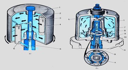 В центрифугах (рис. а) масло очищается под действием центробежных сил, возникающих при вращении ротора.