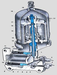 В корпусе фильтра установлены три клапана: перепускной 12, сливной 8 и радиаторный 4.