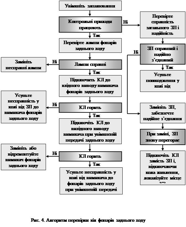 Для локалізації несправностей у системі освітлення і сигналізації на підставі зовнішніх ознак доцільно користуватися умовними алгоритмами пошуку несправностей (діагностичними картами) рис. 2.24 – 2.28. На рисунках прийняті такі скорочення: КЛ – контрольна лампа; ЗП – запобіжник; ПП – покажчики поворотів; КЗ – коротке замикання; АС – аварійна сигналізація. Діагноз підтверджується шляхом заміни несправного елемента.