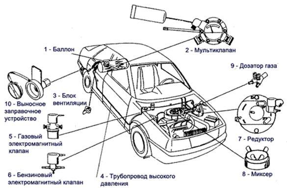 Под действием разряжения, создаваемого во впускном коллекторе работающего двигателя, газ из редуктора по шлангу низкого давления через дозатор (7) поступает в смеситель (8), установленный между воздушным фильтром и дросcельными заслонками карбюратора. Иногда вместо установки смесителя производится непосредственная врезка газовых штуцеров в карбюратор.