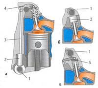 Основными элементами клапана являются головка и стержень. У впускного клапана головку часто делают большего диаметра, чем у выпускного, для улучшения наполнения цилиндра. Клапаны работают в тяжелых условиях, поэтому их изготовляют из высококачественной стали. Для экономии этого материала головки клапанов часто выполняют из жаропрочной стали, а стержни – из углеродистой стали с последующей их приваркой. Плотное прилегание клапана к седлу 2 достигается с помощью фаски на головке клапана. По поверхности фаски осуществляется притирка клапана к седлу, что обеспечивает герметичность уплотнения.