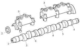 1 - распределительный вал; 2 – сальник; 3 - крышка подшипников распределительного вала; 4 – эксцентрик привода топливного насоса; 5 – кулачки; 6 – опорные шейки.
