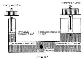 "Давление на поверхности жидкости, вызванное внешними силами, передается жидкостью одинаково во всех направлениях". В правом цилиндре (рис. 6-1) создается давление пропорциональное площади поршня и приложенному усилию. Если к поршню приложено усилие 100 кг, а его площадь -10 см2