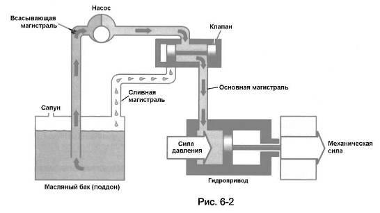 Любую гидравлическую систему управления АКПП упрощенно можно представить в виде системы, состоящей из резервуара (поддона), насоса, клапанов, соединительных каналов (магистралей) и устройств, преобразующих гидравлическую энергию в механическую (гидропривод) (рис.6-2).
