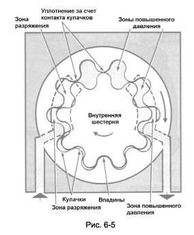 Внутренний ротор, являющаяся ведущим элементом, с помощью кулачков вращает внешний ротор. Насосная камера формируется между кулачками и впадинами роторов. При вращении кулачки выходят из впадин, и камера увеличивается, создавая при этом зону разряжения. В дальнейшем кулачки внешнего и внутреннего роторов вновь входят в контакт, постепенно уменьшая объём камеры. В результате чего жидкость вытесняется в напорную магистраль (рис.6-5).