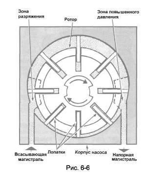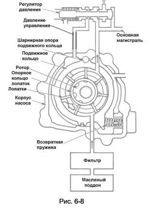 Ротор размещен в цилиндрическом отверстии корпуса насоса с некоторым эксцентриситетом, поэтому нижняя часть ротора расположена ближе к цилиндрической поверхности корпуса насоса (рис.6-6), а верхняя часть - дальше. При выходе лопаток из зоны, где ротор расположен ближе к корпусу насоса, в насосной камере возникает разряжение. В результате ATF из поддона под действием атмосферного давления выталкивается в напорную магистраль. При дальнейшем повороте ротора, после прохождения точки максимального удаления ротора от цилиндрической поверхности корпуса, насосная камера начинает уменьшаться. Давление жидкости в ней увеличивается, и далее ATF под давлением попадает в напорную магистраль.