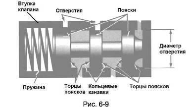 Большинство клапанов, используемых в системах управления АКПП, представляют собой клапаны золотникового типа и несколько напоминают катушку (рис.6-9). Клапан имеет, как минимум, два пояска, с помощь которых образуется кольцевая канавка.