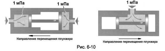 Торцы поясков, образующих кольцевые канавки, не всегда имею одинаковый диаметр. Разные диаметры торцевых поверхностей поясков позволяют формировать силы, действующие на клапан, различной величины, поскольку согласно основному закону гидравлики сила давления, действующего на какую-либо поверхность прямо пропорциональна площади этой поверхности. С помощью поясков различного диаметра также можно осуществлять управление положением клапана относительно отверстий. При равном давлении клапан будет перемещаться в сторону действия той силы, которая формируется на большей площади (рис.6-10).