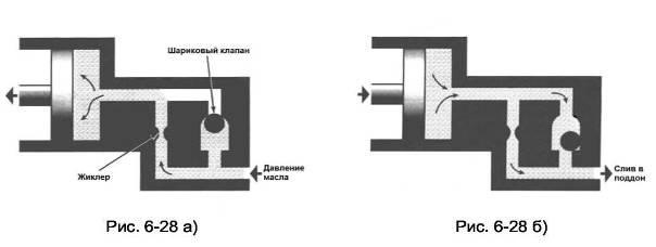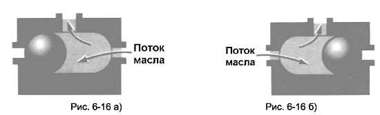 При поступлении жидкости из правой входной магистрали шарик перекатывается и садится в левое седло клапана, перекрывая тем самым доступ жидкости в левую входную магистраль (рис.6-16а). ATF из правой входной магистрали через клапан направляется в выходную магистраль. В случае, если жидкость подводится к клапану через левую входную магистраль, шарик перекрывает правую входную магистраль (рис.6-16б), обеспечивая тем самым доступ ATF из левой входной магистрали в выходную магистраль.