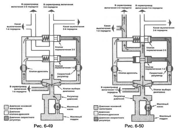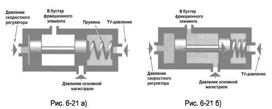 Одно из двух упомянутых положений клапана переключения определяется тремя факторами: давлением скоростного регулятора, давлением клапана-дросселя и жёсткостью пружины. На левый торец клапана действует сила пружины, и к этому же торцу подводится давление клапана-дросселя (TV-давление). К правому же торцу клапана подводится давление скоростного регулятора. При неподвижном автомобиле давление скоростного регулятора TV-давление, практически, равны нулю, поэтому клапан под действием пружины будет находиться в крайнем правом положении, разъединяя основную магистраль и канал подвода давления в гидропривод фрикционного элемента (рис.6-48а). После начала движения начинают формироваться давления скоростного регулятора и TV-давление. Причем, при неизменном положении педали управления дроссельной заслонкой, давление клапана-дросселя будет оставаться постоянным, а давление скоростного регулятора по мере увеличения скорости движения автомобиля будет увеличиваться. При определенной скорости давление скоростного регулятора достигнет величины, при которой сила, создаваемая им на правый торец клапана переключения, станет больше суммы силы пружины и TV-давления, которые действуют на левый торец клапана. В результате клапан переместится из крайнего правого положения в крайнее левое положение и соединит канал подвода давления в гидропривод фрикционного элемента с основной магистралью. Таким образом, происходит повышающее переключение.