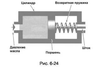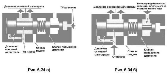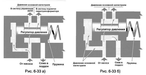 Любой клапан переключения это клапан золотникового типа, к которому подводится давление основной магистрали. Клапан переключения может занимать только два положения либо крайнее правое (рис.6-48а), либо крайнее левое (рис.6-48б). В первом случае правый поясок клапана перекрывает отверстие основной магистрали, и давление не поступает в гидропривод фрикционного элемента управления АКПП. В случае перемещения клапана в крайнее левое положение он открывает отверстие основной магистрали, соединяя ее тем самым с каналом подвода давления в гидропривод.