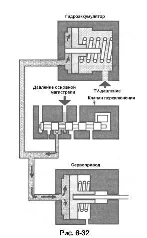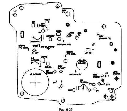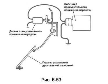 принудительного понижения передачи (рис.6-53). При наличии сигнала управления соленоид открывает дополнительный канал подвода максимального TV-давления к клапану переключения.