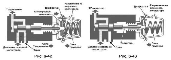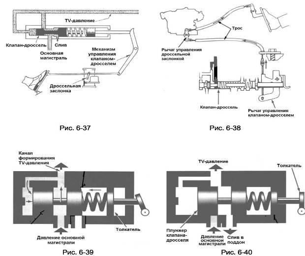 Для получения давления, зависящего от загруженности двигателя, используется клапан-дроссель, который, чаще всего располагается в клапанной коробке. Управление этим клапаном на различных моделях АКПП осуществляется двумя различными способами. В соответствии с первым способом используется механическая связь между дроссельной заслонкой двигателя и клапаном-дросселем. В качестве механической связи может использовать либо трос, либо система тяг и рычагов. Во втором способе для управления клапаном-дросселем используется вакуумный модулятор. Модулятор с помощью трубки соединен с задроссельным пространством впускного коллектора двигателя. Степень разряжения во впускном коллекторе и является задающим параметром для получения давления, пропорционального степени загруженности двигателя. Чем выше загрузка двигателя, тем выше давление, которое формирует клапан-дроссель. Часто давление клапана-дросселя называю TV-давлением, что происходит от английского словосочетания «ThrottleValvepressure».