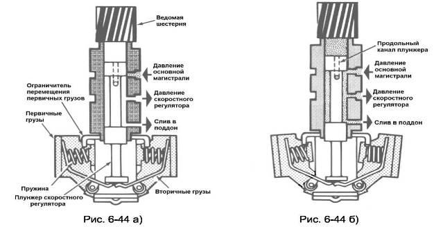 Начиная с определенных оборотов, скоростного регулятора центробежная сила, которая, как известно, зависит от квадрата частоты вращения, становится весьма большой. Так, например, двукратное увеличение оборотов увеличивает центробежную силу в четыре раза. Поэтому становится необходимо принять меры к снижению влияния центробежной силы на формируемое скоростным регулятором давление. Жёсткость пружин подобрана таким образом, что, примерно, на скорости движения 20 миль/ч (16 км/ч), центробежная сила первичных грузов превышает силу пружины, и они отклоняются в крайнее положение и упираются в ограничители (рис.6-44б). Первичные грузы в таком положении не воздействуют на вторичные и становятся неэффективными, а клапан скоростного регулятора на втором этапе уравновешивается центробежной силой только вторичных грузов и силой пружины.
