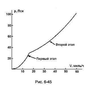 Система грузов скоростного регулятора состоит из двух ступеней (первичной и вторичной) и двух пружин. Такое устройство регулятора позволяет получить зависимость давления скоростного регулятора (р) от скорости движения автомобиля (V) близкую к линейной (рис.6-45).