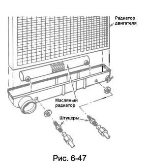 Для охлаждения ATF используются два типа радиаторов: внутренний или внешний. На многих современных автомобилях используются внутренний тип радиатора. В этом случае он расположен внутри радиатора охлаждающей жидкости двигателя (рис.6-47). Горячая жидкость поступает в радиатор, где отдает тепло, охлаждающей жидкости двигателя, которая, в свою очередь, охлаждается воздушным потоком.