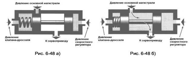 Основными параметрами состояния автомобиля, по соотношению которых в АКПП определяются моменты переключения передач, являются скорость движения автомобиля и загруженность двигателя, определяемая углом открытия дроссельной заслонки и оборотами коленчатого вала. В чисто гидравлических системах управления для определения этих двух параметров формируются соответствующие давления, для чего используется давление основной магистрали, которое подводится к соответствующему клапану, на выходе из которого, в зависимости от назначения клапана, формируется либо давление пропорциональное скорости движения автомобиля, либо давление пропорциональное степени открытия дроссельной заслонки.