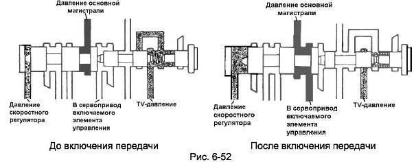 После того, как произошло повышающее переключение (1-2 или 2-3), в соответствующем клапане переключения (1-2 или 2-3) происходит блокировка канала подвода давления клапана-дросселя (рис.6-52). В этом случае силе давления скоростного регулятора, действующей на торец клапана переключения, противодействует только усилие сжатой пружины. Такая отсечка TV-давления от клапана переключения действует как фиксатор для предотвращения включения пониженной передачи и устраняет возможность возникновения колебательного процесса при переключении передач.