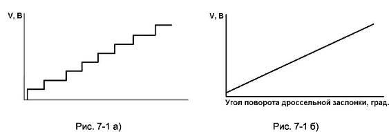 Сигналы датчиков, поступающих в блок управления, могут быть как в форме аналогового сигнала (рис.7-1а) (непрерывно изменяющегося), так и в форме дискретного сигнала (рис.7-1б).