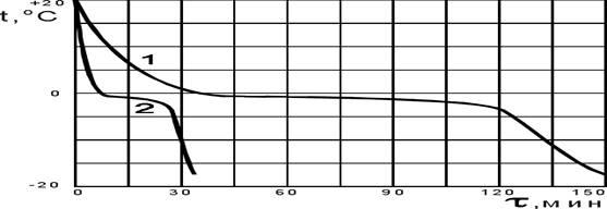 В процессе замораживания можно выделить три диапазона температур в центре продукта от +20 до 0°С, от 0 до -5 °С и от -5 до -18 °С (см. рис. 1, график 1). На первом этапе происходит охлаждение продукта от +20 до 0 °С. Снижение температуры продукта здесь идет пропорционально количеству работы по отбору тепла. Рис. 1 Процесс заморозкиНа втором этапе происходит переход из жидкой фазы в твердую при температурах от 0 до -5 °С. Работа по отбору тепла у продукта весьма значительна, однако температура продукта практически не снижается, а происходит кристаллизация примерно 70% жидких фракций продукта, которую назовем подмораживанием. На третьем этапе происходит домораживание при температурах продукта от -5 до -18 °С. Снижение температуры опять идет пропорционально выполняемой холодильной машиной работы. Традиционная технология замораживания, реализованная в виде так называемых низкотемпературных холодильных камер, предполагает температуру в камере -18 ? -24 °С. Время заморозки в холодильных камерах составляет 2,5 часа и выше. При замораживании решающую роль приобретает скорость процесса. Установлена тесная связь качества продукта со скоростью замораживания. Многочисленные экспериментальные данные свидетельствуют о влиянии скорости замораживания на размер кристаллов льда, на структурные и ферментативные изменения в продуктах. Идея технологии шоковой заморозки состоит в форсировании режимов охлаждения, подмораживания и домораживания продуктов (см. рис. 1 график 2).