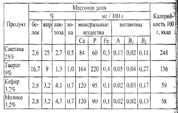 В приложении 3 приведен химический состав и калорийность сметаны, творога и кефира в сравнении с химическим составом молока.