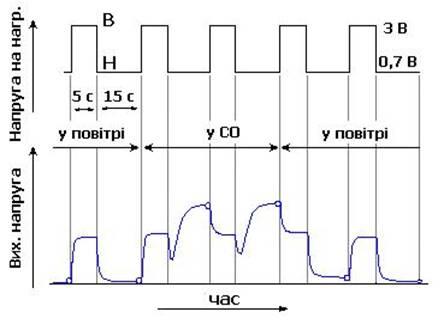 При використанні цього режиму роботи можна досягти високої чутливості АЧЕ до того чи іншого газу з хорошою селективністю і відтворюваністю сигналу завдяки тому, що поверхня чутливого елемента очищується при високій температурі в кожному циклі. Прикладами практичної реалізації цього режиму роботи є елемент SB-50 японської фірми FIS, у якого термоочистка здійснюється через кожні 15 с і триває протягом 5 с [4]. Принцип роботи такого АЧЕ показано на рис. 1.3.