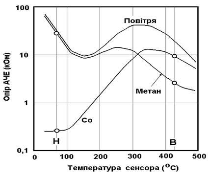 При роботі АЧЕ в режимі циклічної зміни робочої температури можливо визначати два гази: при низькій температурі (Н) – оксид вуглецю, а при високій (В) – метан, як показано на рис. 1.5.