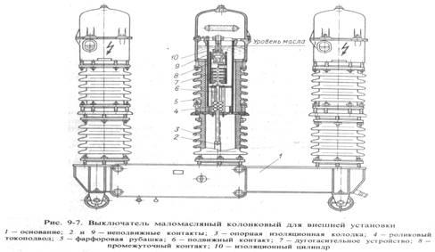 Выключатели маломасляные. В отличие от масляных баковых выключателей масло служит здесь только дугогасящей средой, а изоляция токоведущих частей и дугогасительного устройства относительно земли осуществляется с помощью 150 твердых изоляционных материалов (керамика, текстолит, эпоксидные смолы и т.п.). Диаметры цилиндров у этих выключателей значительно меньше по сравнению с диаметрами баков масляных баковых выключателей, соответственно намного меньше объем и масса заливаемого в цилиндры масла. Меньшая, чем у бакового выключателя, прочность корпуса по отношению к давлениям, создаваемым при отключении предельных токов короткого замыкания, ограничивает отключающую способность маломасляного выключателя.